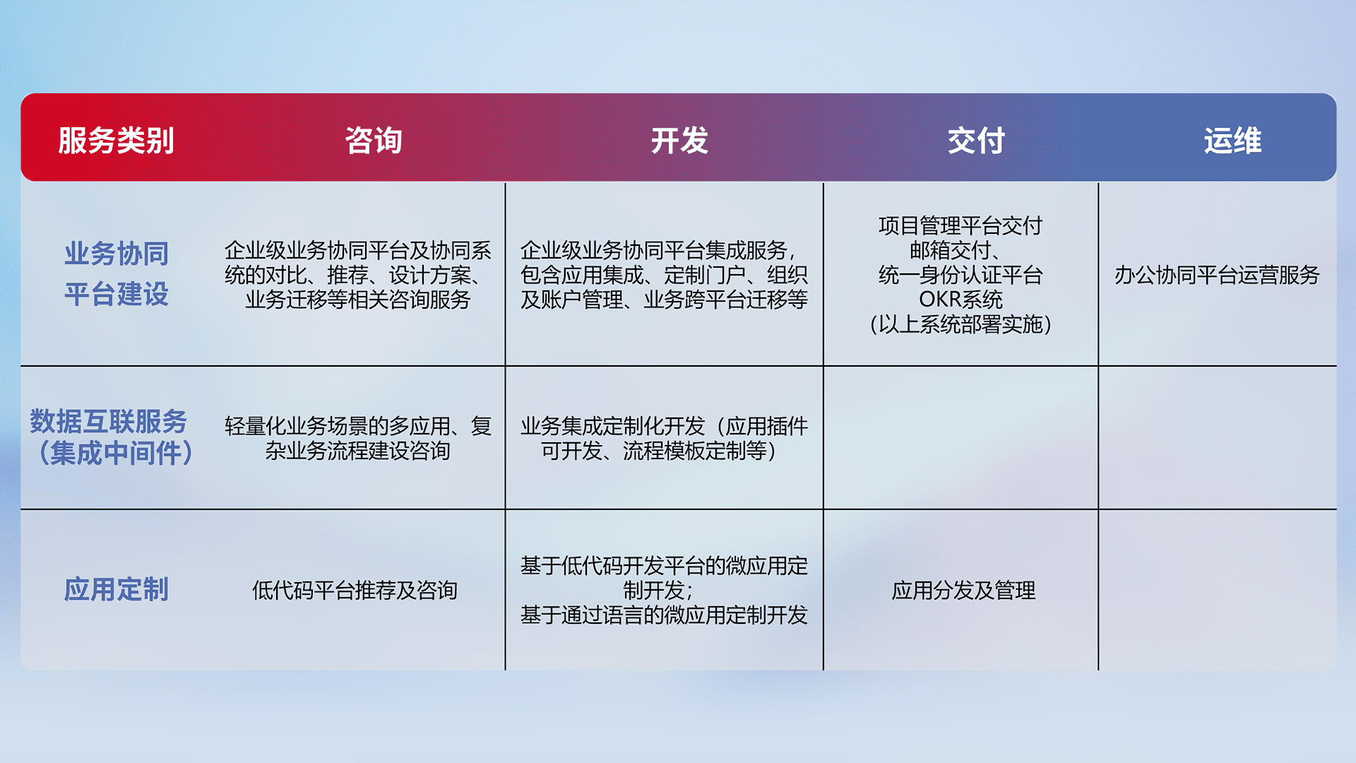 针对钉钉、、、、企微、、、、IDaas等平台级产品提供产品的规划、、方案、、、交付、、、定制化开发等服务,,,实现如统一协同办公、、智能客户服务、、、、混合会议管理、、、智能数据查询、、、等业务场景,,实现数字化转型。。。。