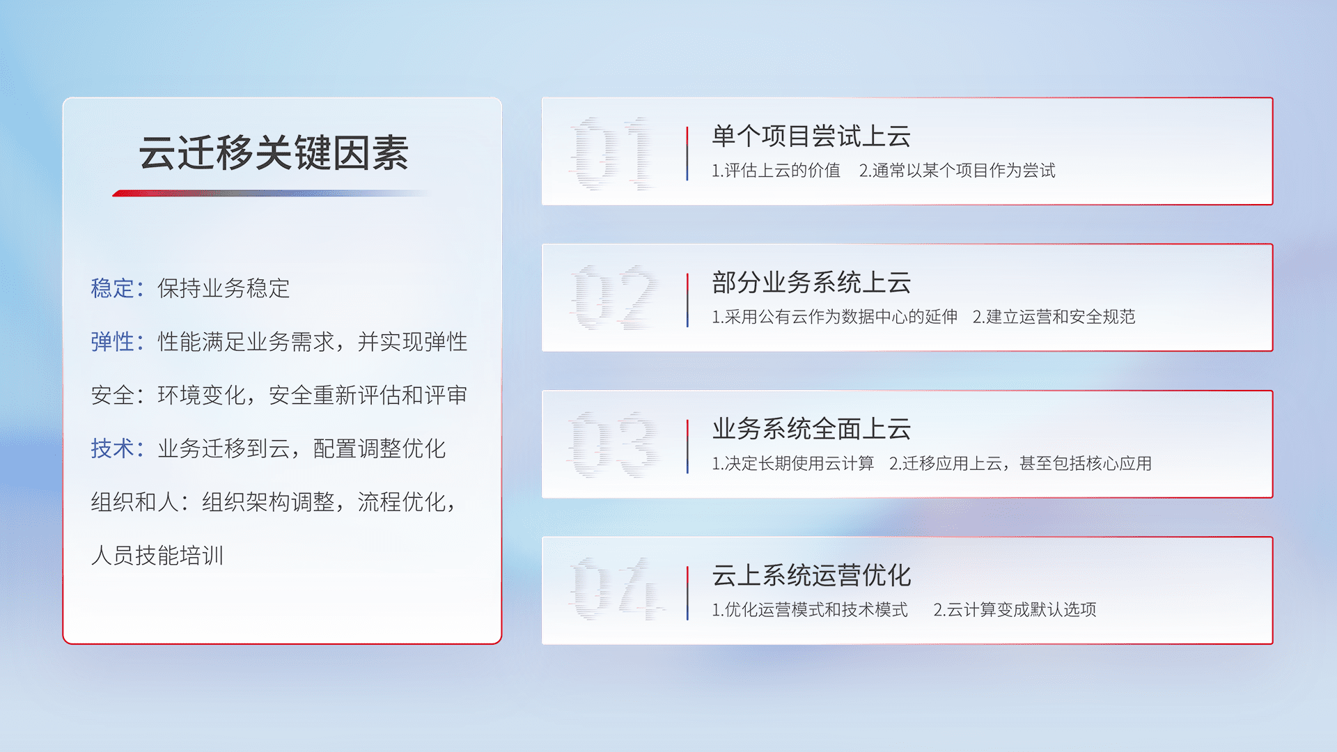 结合实际业务,,,从规划设计、、云平台选型、、、云原生改造、、数据迁移、、集成交付,,迁移全过程为客户识别最佳上云路径,,,,做好风险识别管理,,设计网络架构、、、身份权限、、、安全审计合规、、、操作审计、、日志审计、、、监控告警策略、、、、多站点容灾设计等,,,,对云上基础设施进行整体规划,,提升IT治理水平,,,,以满足弹性、、、高可用、、、、高性能的需求。。。
