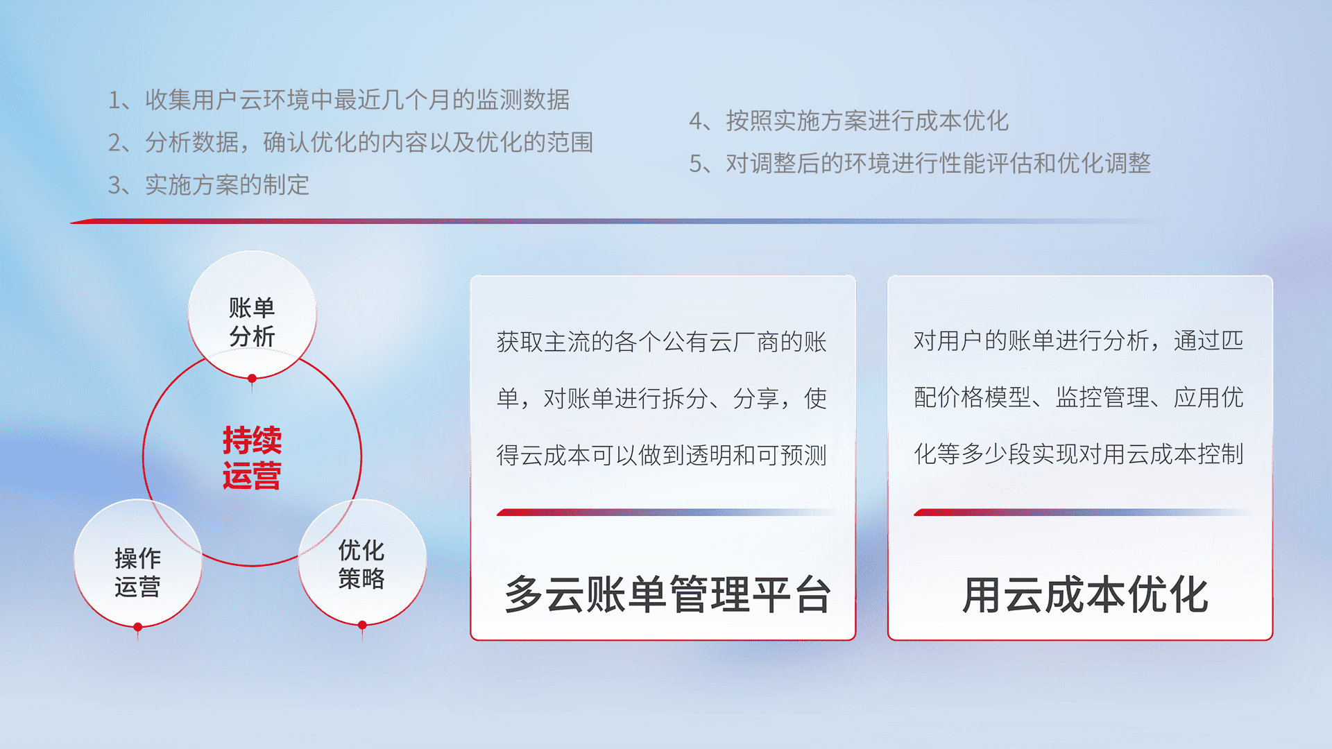 通过多云纳管,,以统一的资源数据模型把客户的云资源进行抽象和封装,,,进而实现对多云资源的统一操作,,,,保障云资源管理的可靠性、、稳定性与可用性。。。。量身定制化运维内容,,配置、、、开发运维、、、、补丁管理、、、、备份、、监控、、、、认证和访问管理、、、审计和日常巡检等,,,保障在用云过程中的可靠度,,,稳定度以及高可用率。。。。